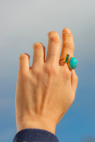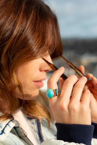 Bague en or jaune 18ct, tourmaline 1,245ct et turquoise 8,645ct.