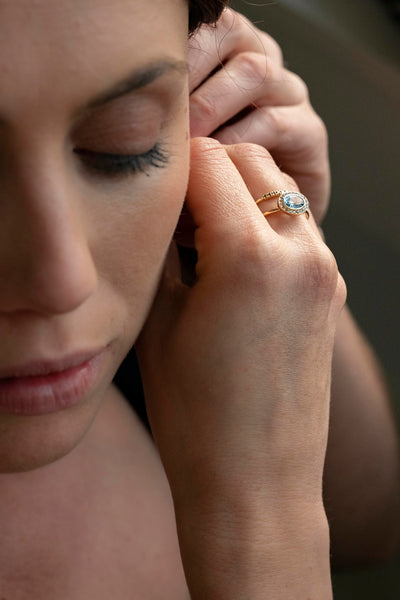 Aigue-marine 0.55ct et brillants chocolat 0.10ct.